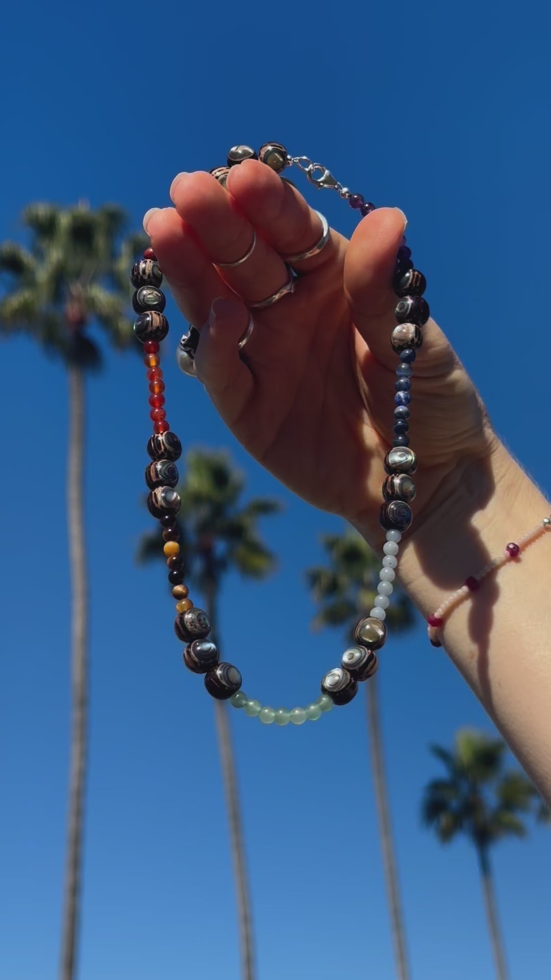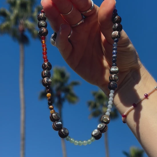 This piece is a lightweight reminder that you are limitless. The universe belongs to you, just like it belongs to all of us, & maybe these colors will help you remember to unify your energy & make your path toward whatever is calling you. Beautiful shimmering Abalone sparkles as it is inlaid in round Coconut Shell beads for happy tropical vibrations. Designed with the Chakras in mind, each type of natural crystal stone on this necklace represents one of the 7 energy centers. Please see the list of crystals below for each crystal's Chakra representation. An inclusive piece, these crystal stones were intentionally chosen to include ALL signs of the zodiac: Capricorn, Aquarius, Virgo, Pisces, Cancer, Scorpio, Taurus, Libra, Gemini, Aries, Cancer, Leo, this one's for YOU.