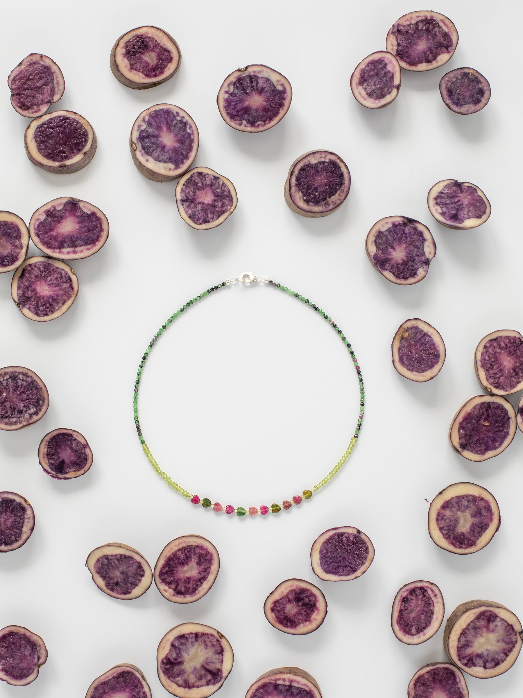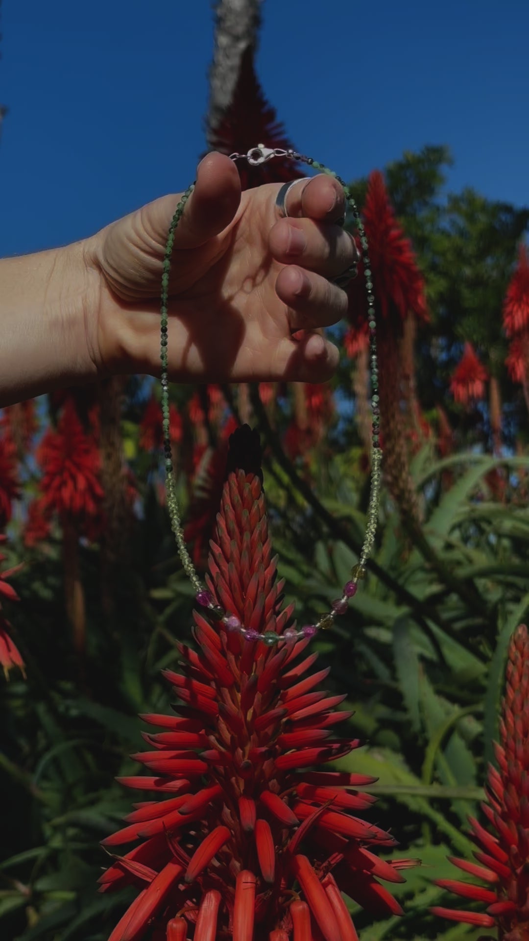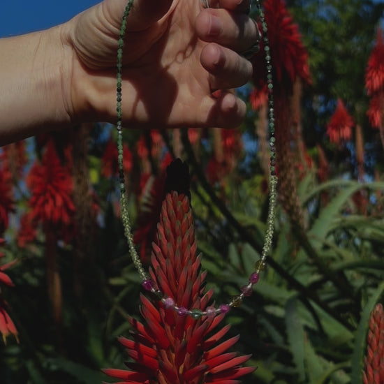 Healing the heart starts with intent. Light Green Peridot sparkles like the sea-sprayed moss growing on the Cypress trees in the sunshine. Green & Pink Tourmaline hearts are crowned by tiny Ruby Zoisite. Comfort & positivity will ground the Heart & Solar Plexus Chakras, designed to add lightness & love for Leos, Virgos, Geminis, Cancers, Scorpios, Sagittarians, & Libras.